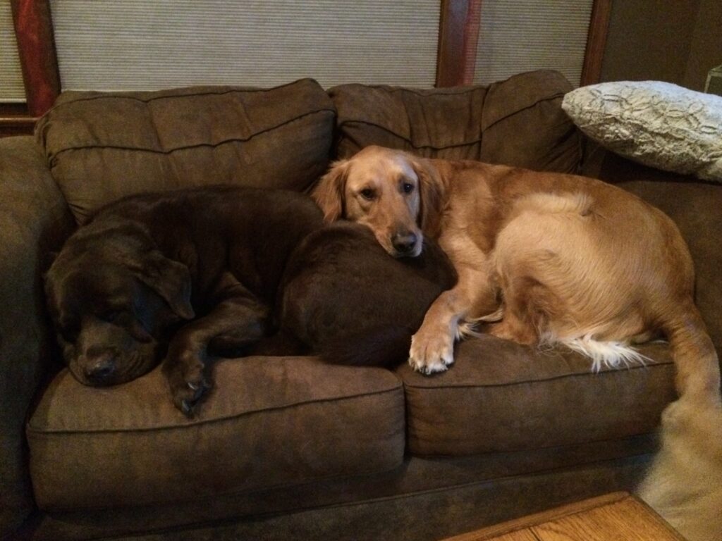 Fast forward to January 2015, and we are happy to hear that Beau is all grown up and continues to love his perfect fur-ever home (he was a 96 lb, 10 month old when he came to GoldHeart and his foster family called him Baby Huey – no wonder!). This second picture is with his new brother, Buddy, who keeps him in line. Can you tell his entire family adores him and he has settled in beautifully? We just have to wonder where their family sits?