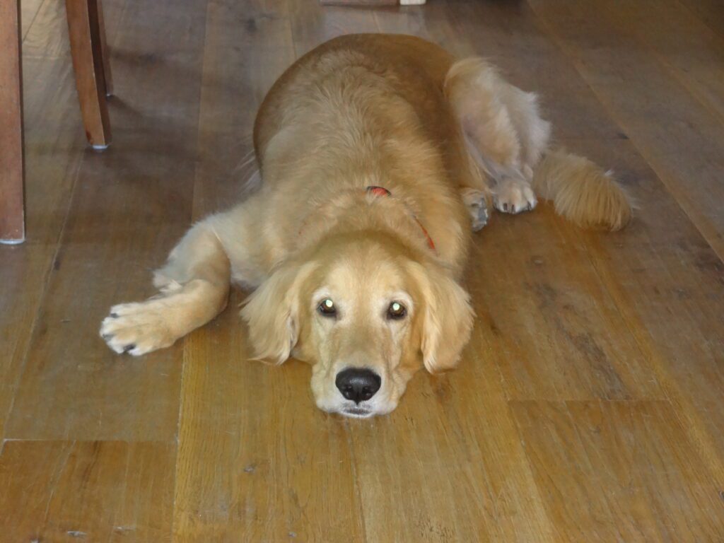 Golden retriever with a purple toy on a wooden floor.