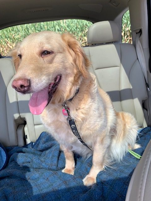 Maggie, is a super sweet “puppy”(inquisitive, curious, funny) in a seven year old body. Maggie spent the first part of her life as a breeder dog. She knew absolutely nothing when arriving in her GoldHeart foster home, but with a lot of patience and love, she has come a long way. Maggie did not even know her name at first. She has learned that going outside is fun (didn’t want to go out at first), and she enjoys being with the other dogs in her foster home and chasing squirrels and bunnies too. Maggie is definitely a velcro-girl, and will follow you everywhere and gets anxious if her humans are out of sight.