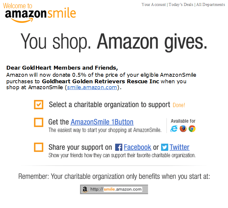 On your first visit to AmazonSmile, you need to select a charitable organization to receive donations from eligible purchases before you begin shopping. We will remember your selection, and then every eligible purchase you make on AmazonSmile will result in a donation. Select Goldheart Golden Retrievers Rescue Inc, Location: Owing Mills, MD.
