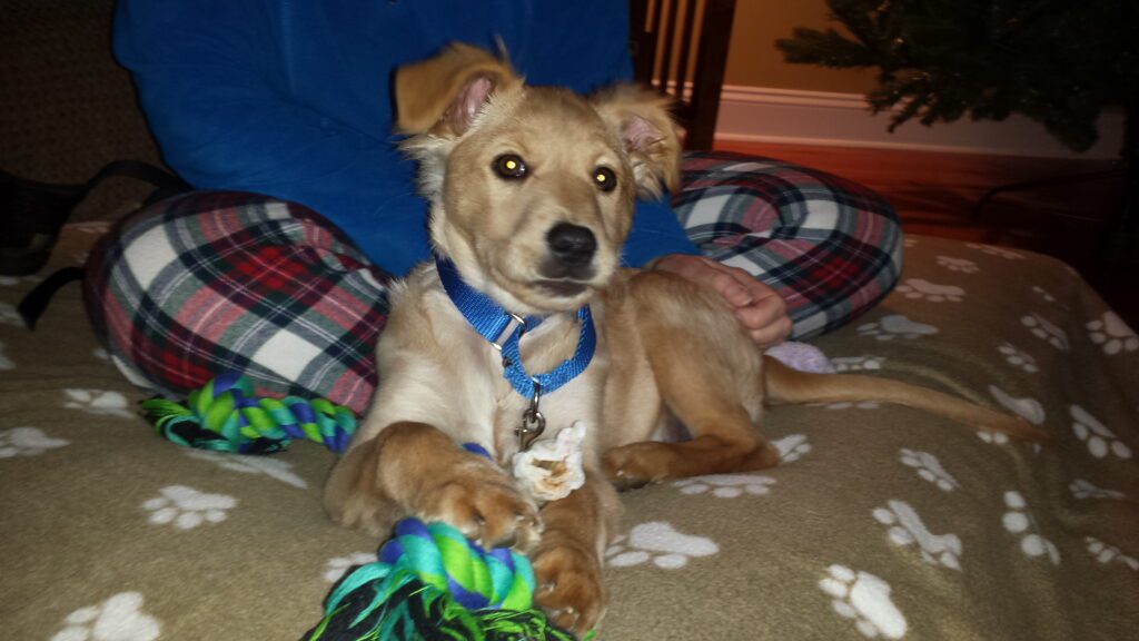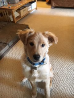 Wrigley is a super cute small Golden mix. He is 5-months old and about 20 pounds. Wrigley has all the colorings, fur feathering, and webbed feet of a Golden, but much smaller and with floppy ears. Like many puppies, Wrigley is high energy. He is quick to do his business while outside. He knows sit, paw, and come and is very smart. He loves to lay on your lap while chewing on a toy/bone. In addition to chewing on toys he loves to play ball and eat ice cubes.