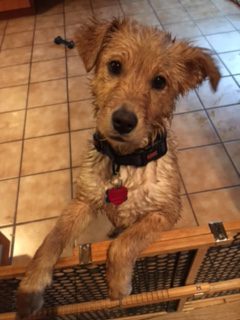 Wrigley is settling in and getting lots of play and exploring time in his awesome forever home. He loves going out in the rain and splashing in puddles (before and after pictures at left), and he just loves to cuddle, chase balls, and even enjoys watching his new Mom cook. Wrigley is certainly a very lucky boy!